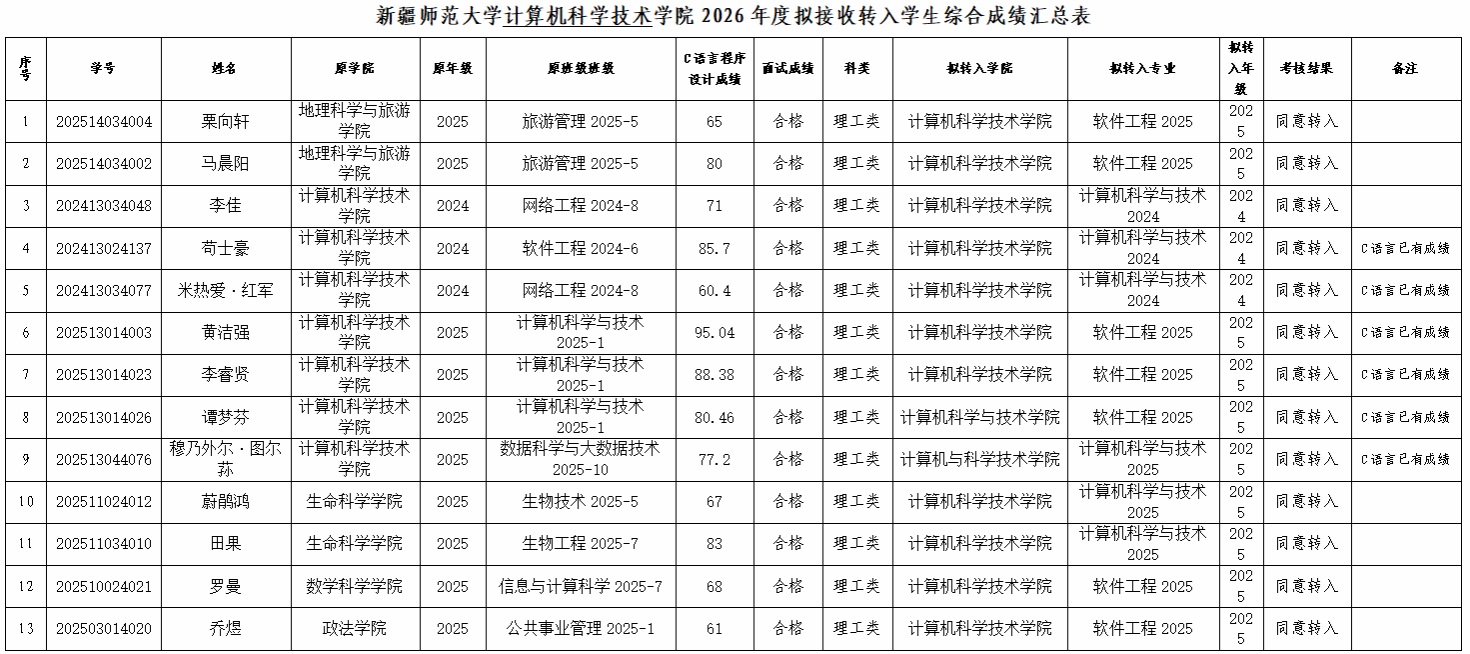 根据教育部令第41号及《新疆师范大学普通本、专科学生转专业实施细则》的相关规定,按照我校2026年度普通本、专科学生考试(考核)转专业整体工作安排,经世俱杯 考核,现将拟接收转入学生名单公示如下:
